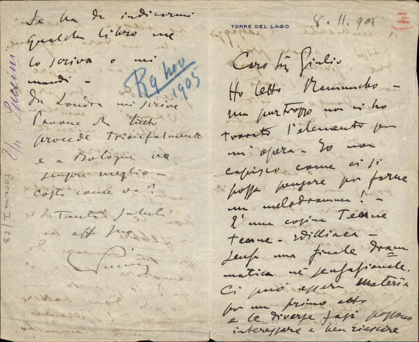 Lettera di Giacomo Puccini a Giulio Ricordi