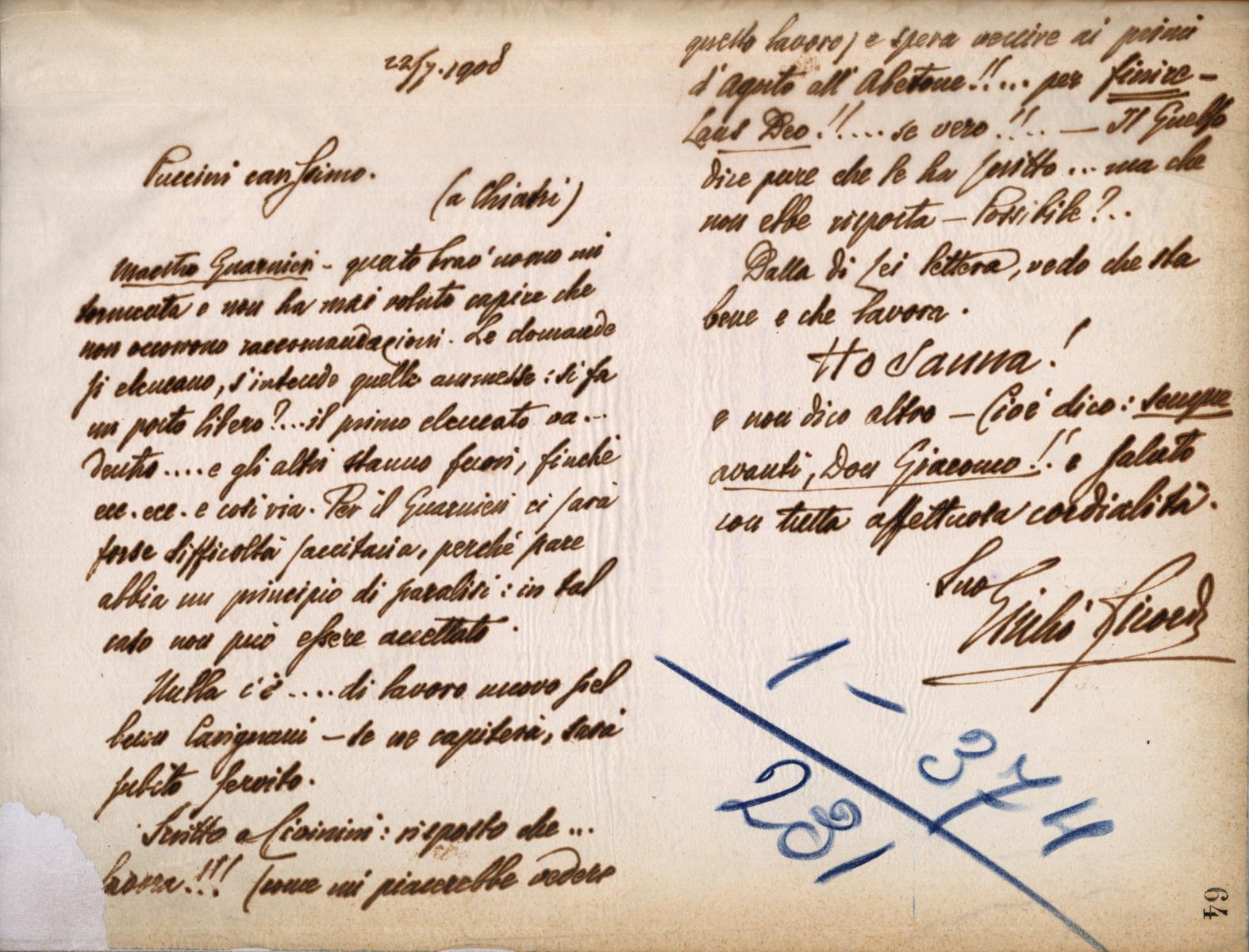 Lettera di Giulio Ricordi a Giacomo Puccini