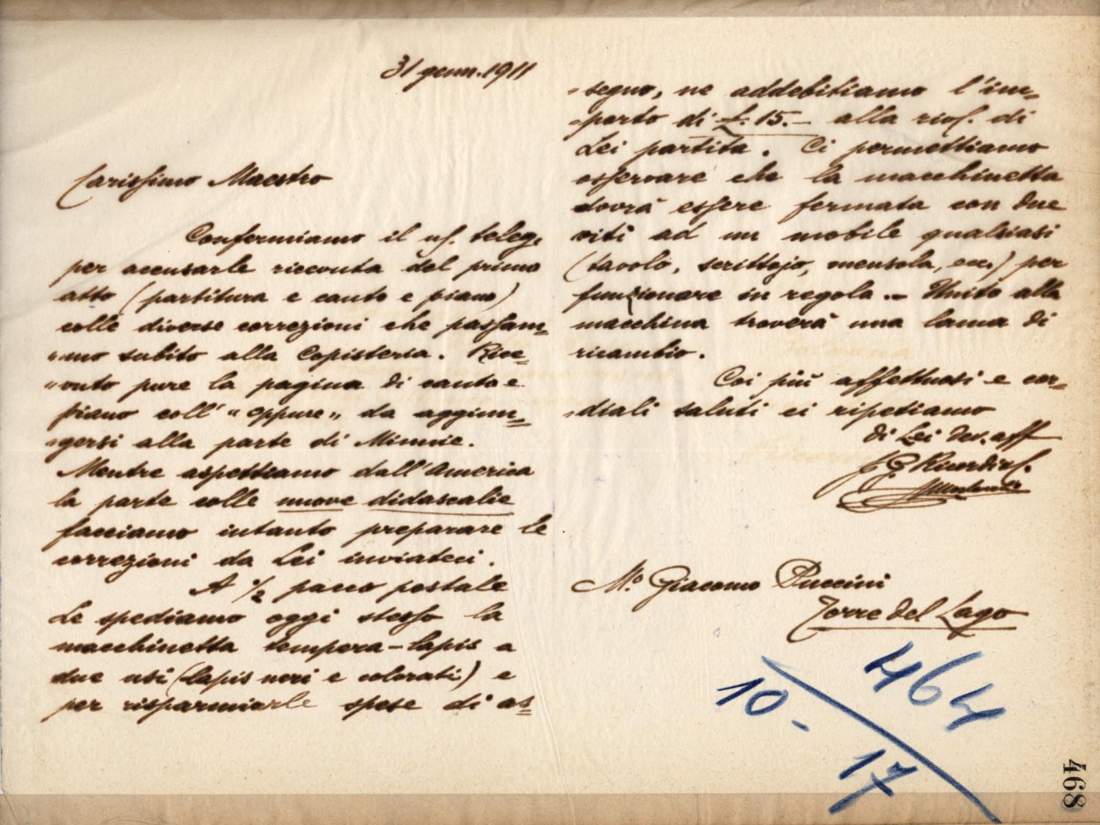 Confermiamo il n/. teleg. per accusarle ricevuta del primo atto (partitura e canto e piano) colle diverse correzioni che passammo subito alla Copisteria. Ricevuto pure la pagina di canto e piano coll'"Oppure" da aggiungersi alla parte di Minnie.