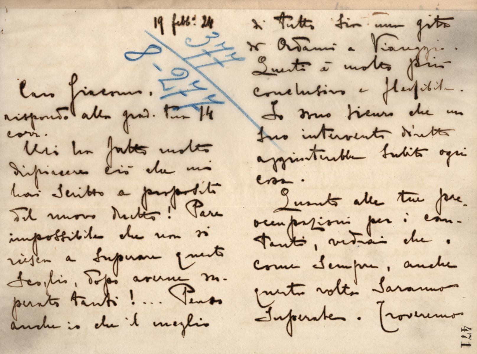 Mi ha fatto molto dispiacere ciò che mi hai scritto a proposito del nuovo duetto! Pare impossibile che non si riesca a superare questo Scoglio, dopo averne superato tanti! . . .Penso anche io che il meglio di tutto sia una gita di Adami a Viareggio. Questo è molto più conclusivo e flessibile.