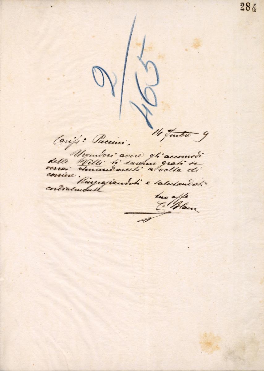 Lettera di Cesare Blanc a Giacomo Puccini