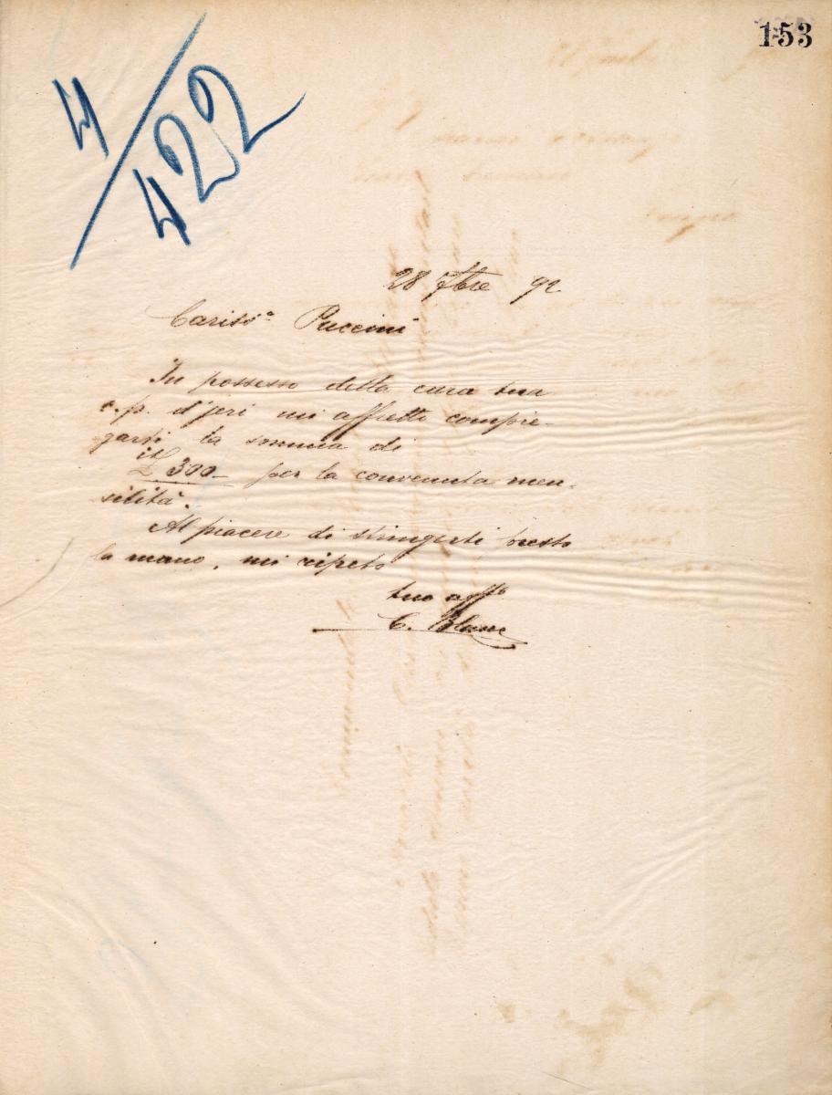 Lettera di Cesare Blanc a Giacomo Puccini