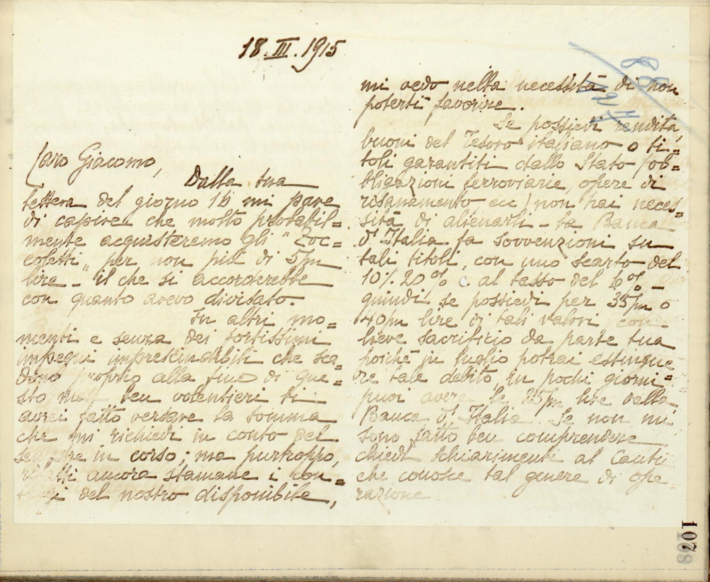 Se possiedi rendita, buoni del Tesoro italiano o titoli garantiti dallo Stato (obbligazioni ferroviarie, opere di risanamento, ecc.) non hai necessità di alienarli – la Banca d'Italia[r] fa sovvenzioni su tali titoli con uno scarto del 10% 20% e al tasso del 10% – quindi se possiedi per 35/m o 40/m lire di tali valori, con lieve sacrificio da parte tua poiché in luglio potrai estinguere tale debito, in pochi giorni puoi avere le 25/m lire dalla Banca d'Italia. Se non mi sono fatto ben comprendere chiedi schiarimenti al Cantù[r] che conosce tal genere di operazione.